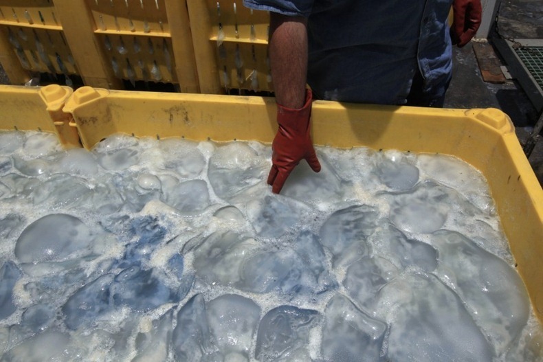 Jellyfish fall from a filter into a container at Orot Rabin power station near Hadera